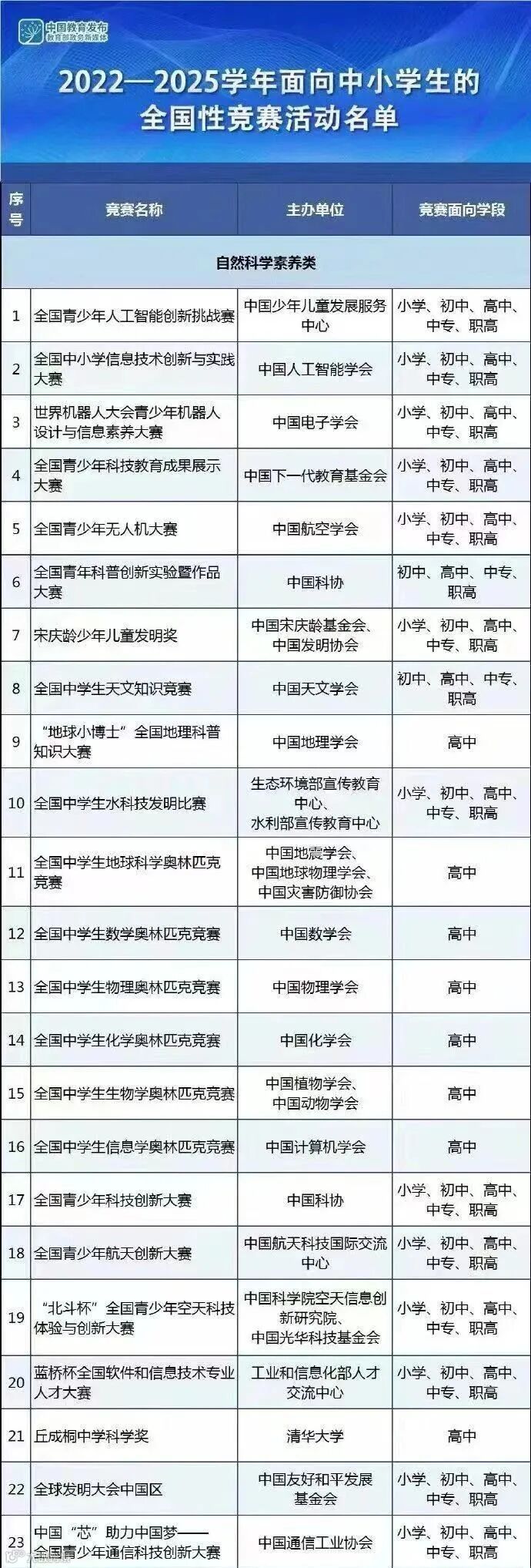 高中阶段在下列赛事中获得国(或省)级三等奖及以上,具体赛事见文章末尾处。