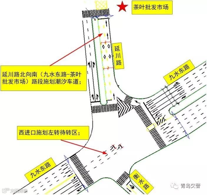 2、延川路北向南茶叶批发市场门前设置潮汐车道,提高北向东左转通行能力,潮汐车道运行时段为每天的7时至9时,其他时段关闭;在潮汐车道起点位置增设潮汐车道指示灯及潮汐车道指示标志,当潮汐车道指示灯显示“