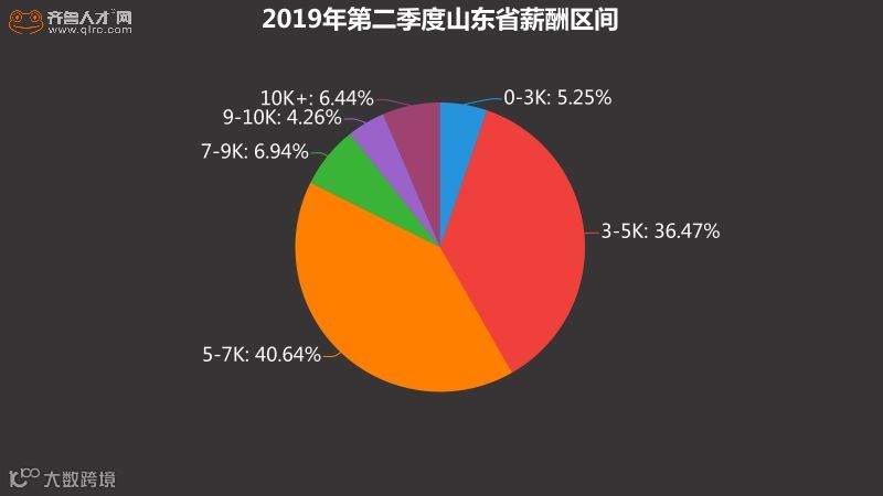 根据2019年山东省第二季度薪酬区间数据显示,5-7k区间已成为当前职场主导,其占比高达40.64%,较排名第二的3-5K高出5个百分点;月薪7-9K者位列第三,其占比为6.94%;当前月薪过万人数也越来越多,以6.44%的占比位列第四;薪酬在0-3K和9-10K位列五六,其占比基本相当,分别为5.25%和4.26%。