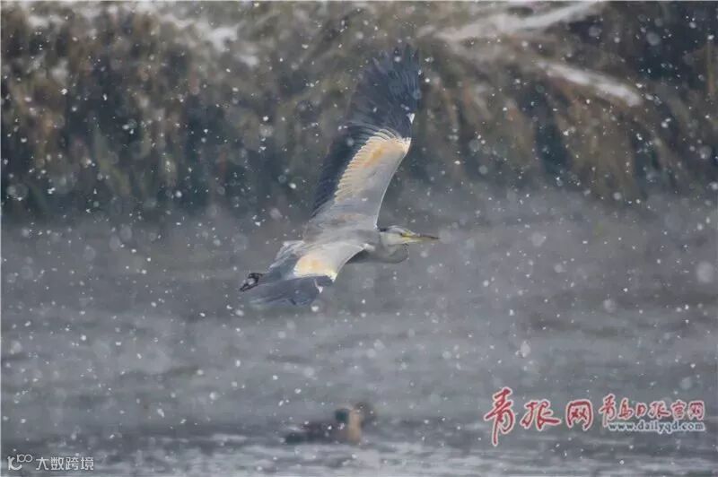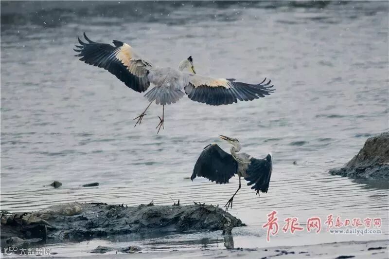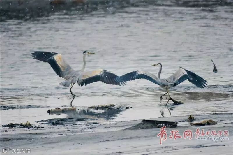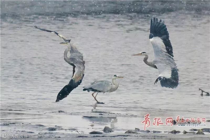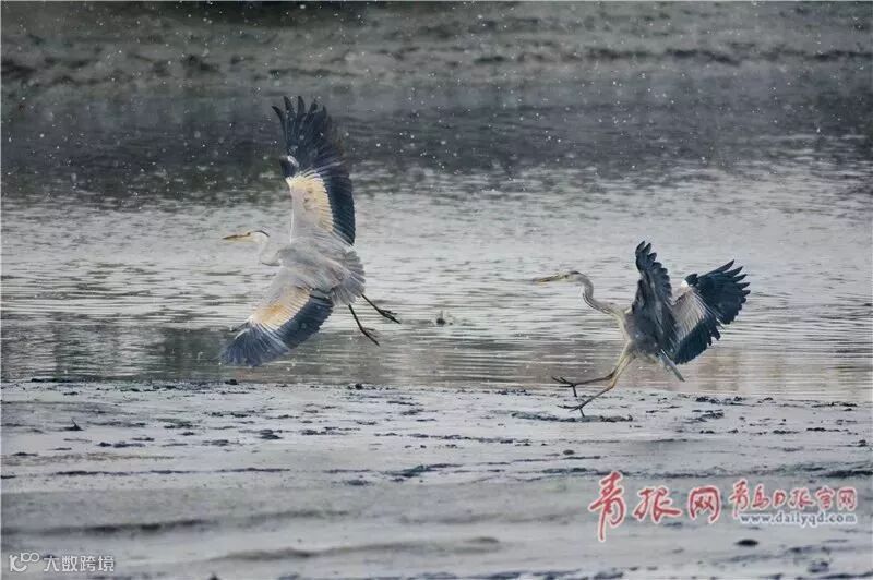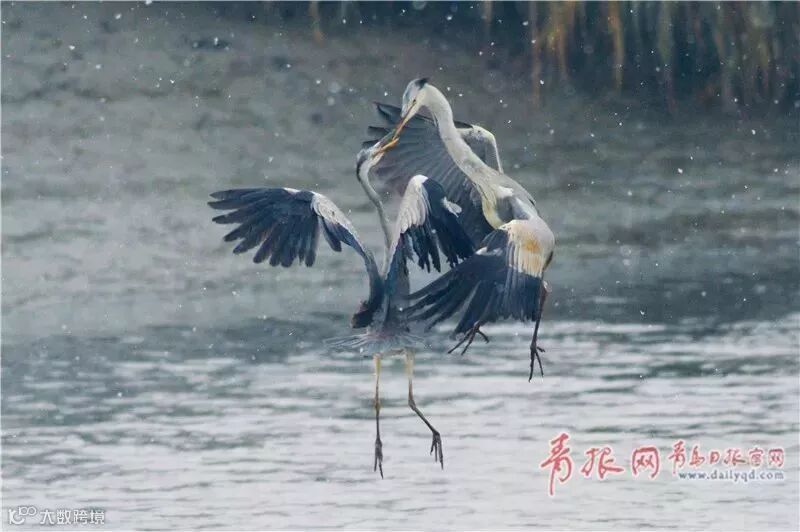 12月11日,在胶州湾墨水河入海口湿地,觅食的苍鹭在严寒中嬉戏“打斗”,风雪中上演了“一出好戏”。