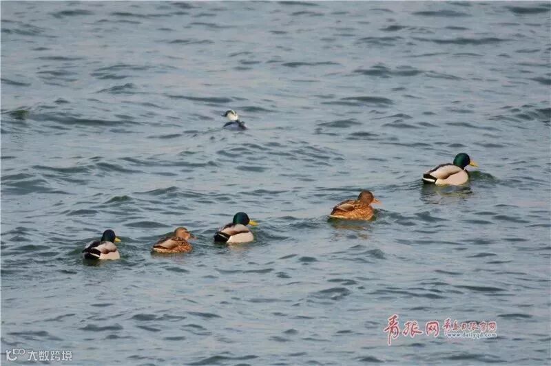 排成一队的绿头鸭在棘洪滩水库悠哉悠哉地浮游,好惬意。