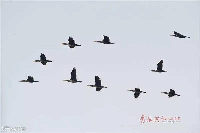 排成“人字”的鸬鹚在城阳棘洪滩水库巡游。