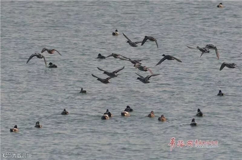 头戴“绿盔”的螺纹鸭在棘洪滩水库组队觅食。