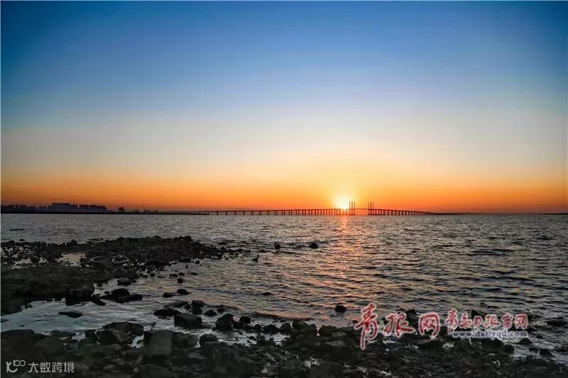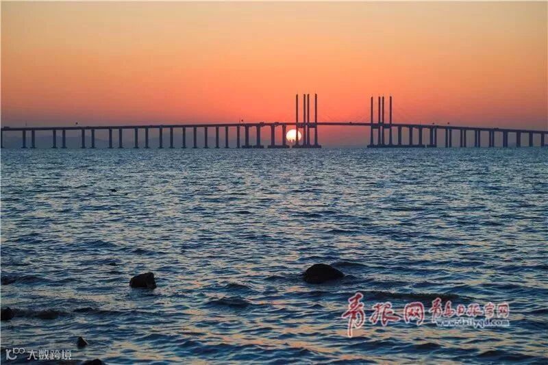 胶州湾大桥如“长虹卧波”,火红的落日,蓝天眷恋着白昼不舍离去。(“青岛观”摄影师 王红涛 摄)