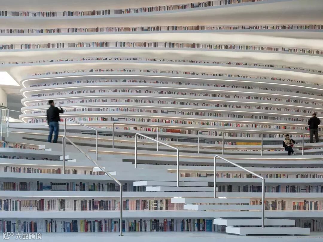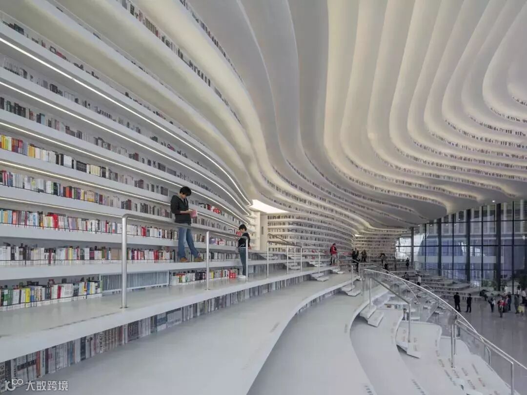踏入图书馆,沿着一排排阶梯拾级而上,白色曲线一层层“荡漾”开来,书籍仿佛置身于“波浪”之中,又变成了一一片书海。每一个书架,都是一个阅读空间,遇到好书,坐下就能阅读,随时都能在知识的海洋里任意遨游。