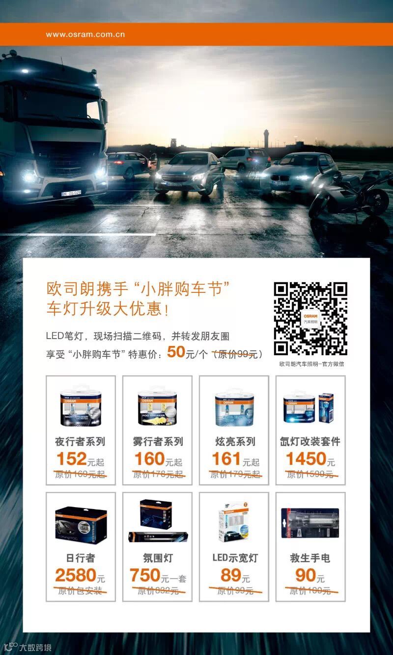 欧司朗也为广大车主谋福利~只要把小欧分享给你的朋友们,就能半价购买欧司朗LED笔灯一支!还有各种经典产品特惠折扣在现场等着大家!还不快来!