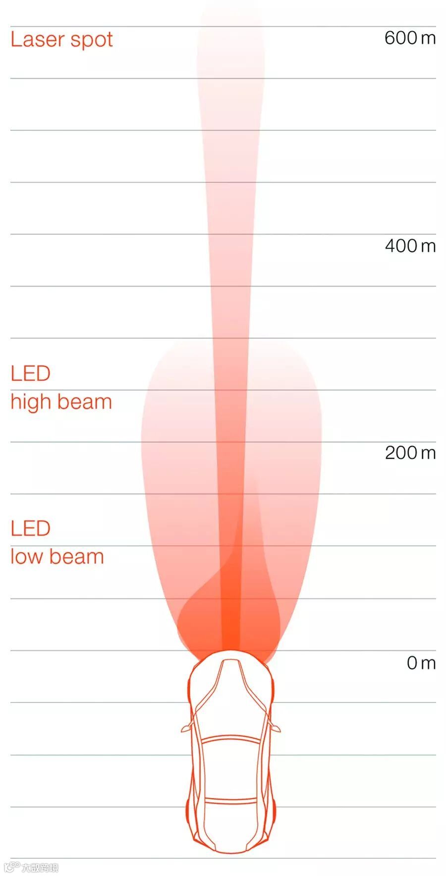 激光灯的高亮度远远超过了现有任何光源的亮度,因此,搭载激光光源的车头灯可以设计得比以往更加小巧。与此同时,基于激光模组的远光灯能够提供最大限度的灯光射程,这将大大提高驾驶员的夜间能见度。与LED光源相比,把激光灯的设计和功能融入到汽车照明中,将为激光灯的未来发展带来巨大的潜力。
