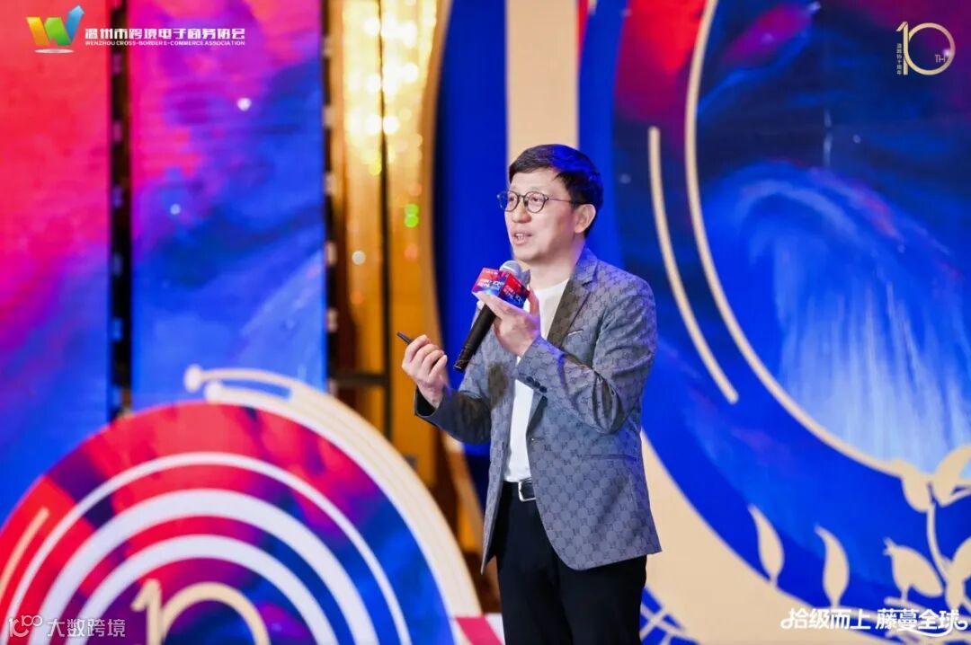 庆典晚宴不仅是欢聚的时刻,更是思想碰撞的舞台。大会特邀顶级行业战略专家顾均辉先生到场助阵并发表主题演讲。他的演讲聚焦于跨境电商行业的未来趋势与对传统产业的赋能路径,为在场近千名嘉宾带来了前沿的行业洞察与战略思考。在全球贸易格局深刻变革、AI技术重塑营销生态的今天,他的分享为温州企业如何在新十年“链全球,再出发”指明了方向,注入了新的智慧动能。