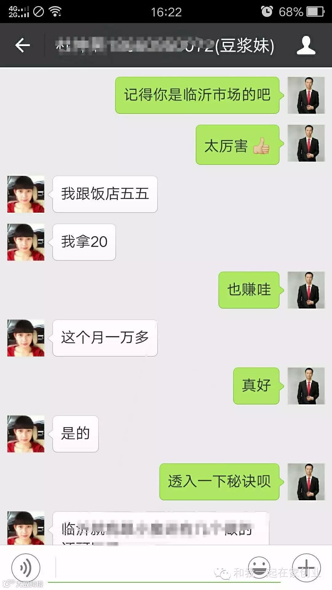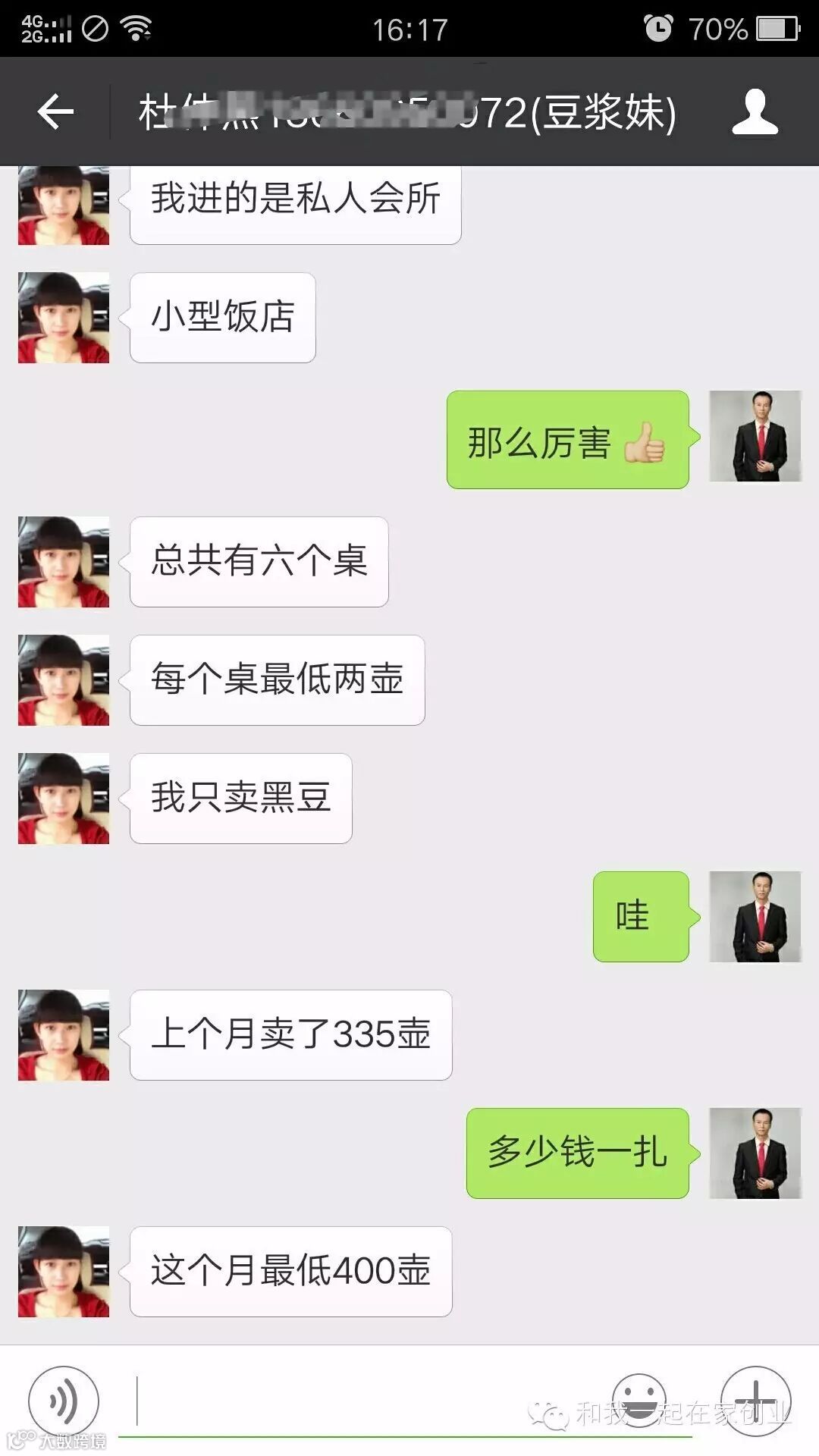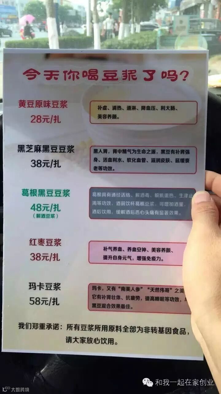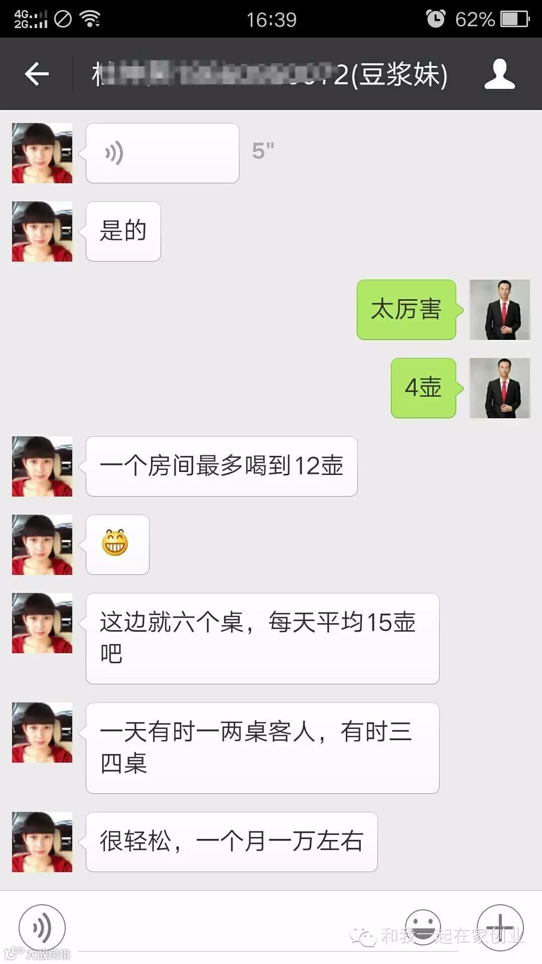 看着图中的豆浆妹是不是也心动了呢?她做的两三家酒店就有月收人过1万,还很轻松。你可以试想一下,你有10家酒店卖我们的豆浆是不是月收人过10万呢。成功其实很简单,就是简单相信,照着去做就可以!!