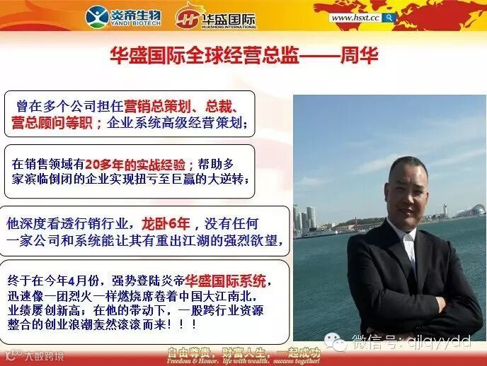 1、炎帝华盛国际系统全球经营总顾问、华盛国际系统决策委、纤家乐全营养大豆市场总监、炎帝产品供应商【湖南华之魅投资管理有限公司-股东】——周华周总