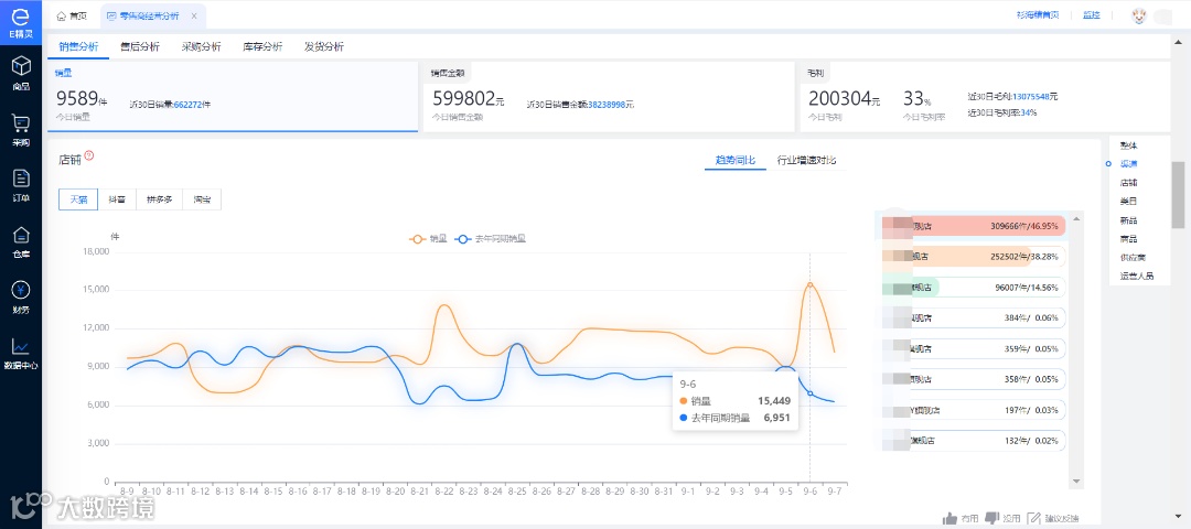 E精灵ERP数据中心可以查看公司整体经营数据。咖范绑定了三家已有的店铺,通过E精灵后台,可以清晰查看每家店铺的经营水平、销量趋势,快速分析各渠道、各店铺、各类目、新品、供应商等的销量情况。