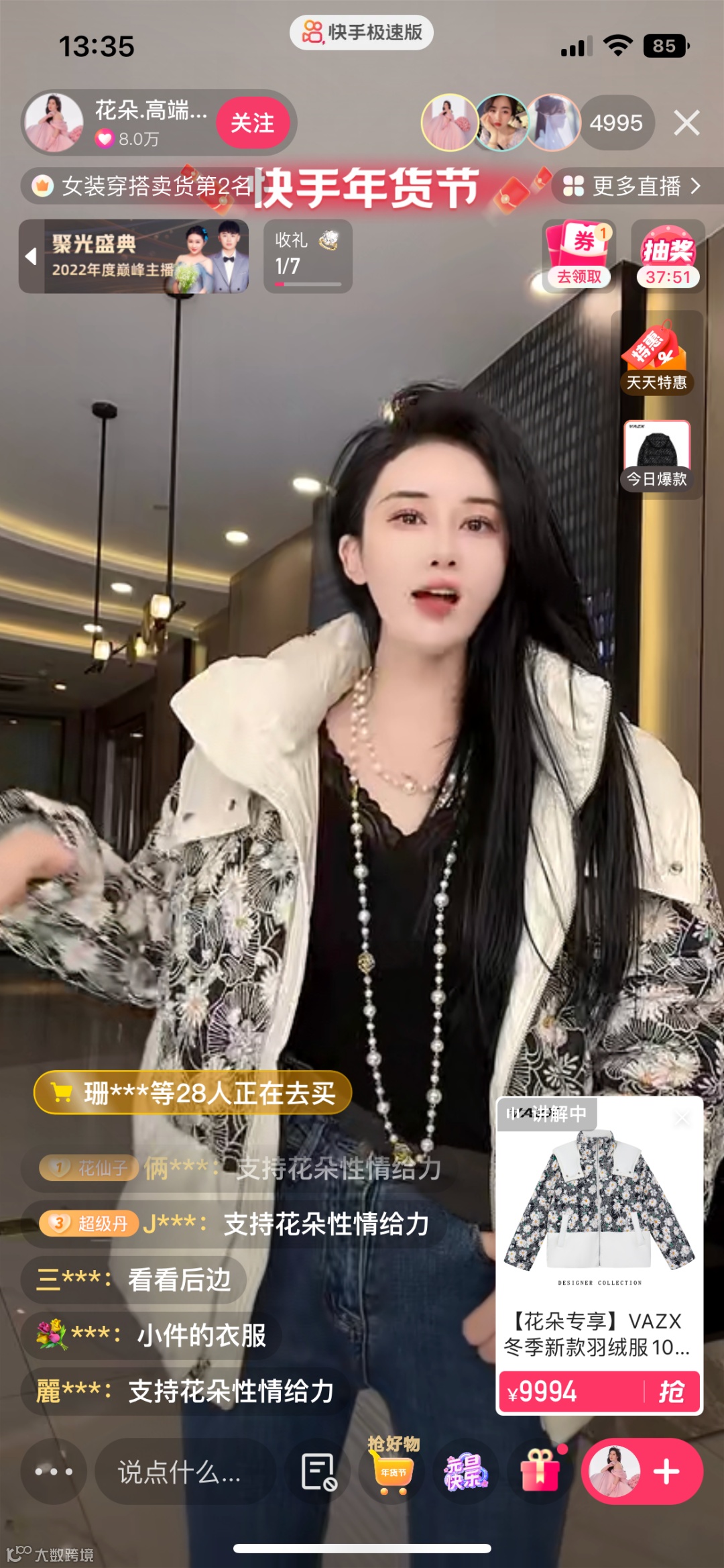 2022年底,花朵在依链平台上选了200+款羽绒服,不到1小时全部卖爆,取得了相当亮眼的成绩。