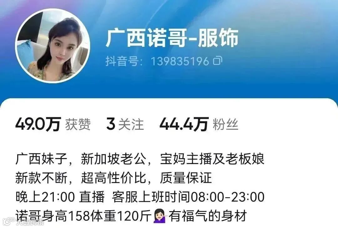 广西诺哥,高性价比女装带货主播,在抖音的粉丝数为44.4W。