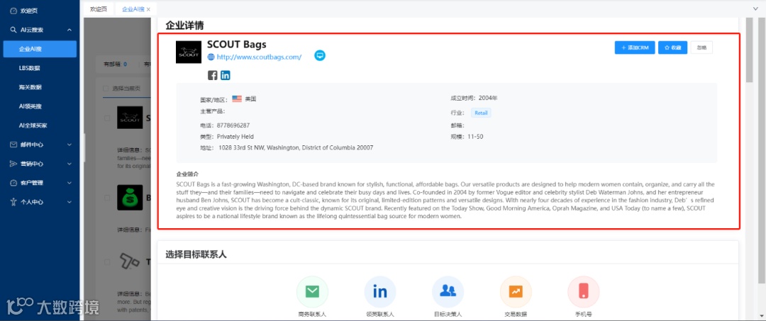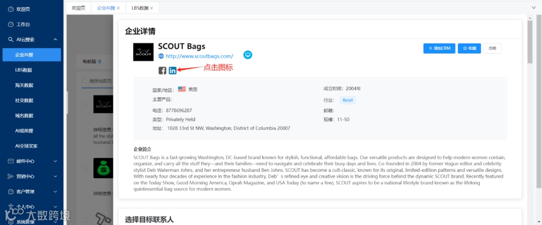 通过RT-SCRM搜索客户,并跳转至客户官网进行一次客户背调 -