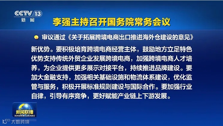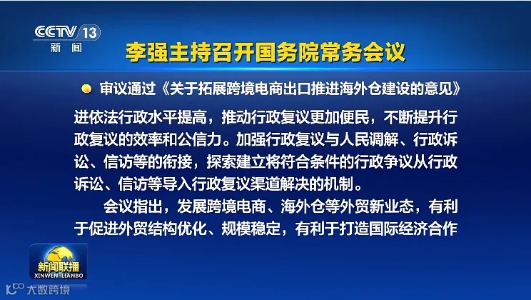 国务院总理李强5月24日主持召开国务院常务会议,听取关于行政复议工作情况的汇报,审议通过《关于拓展跨境电商出口推进海外仓建设的意见》。