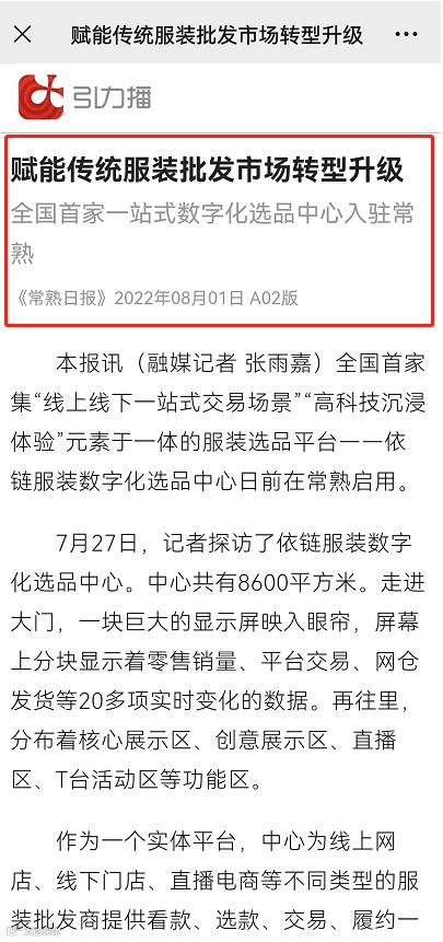最近,比常熟天气还要火热的是谁?那只有——依链服装数字化选品中心!继时尚莫城、常熟服装城对选品中心进行报道后。近日又迎来了常熟电视台、常熟日报的采访,纷纷“点赞”选品中心。除了科技化的数字场景外,反复被媒体提到还有选品中心的“款”。