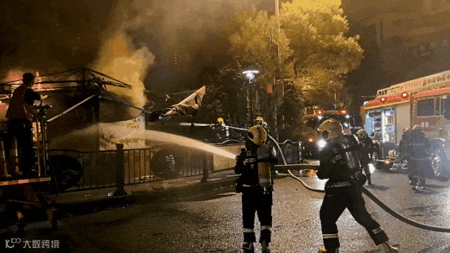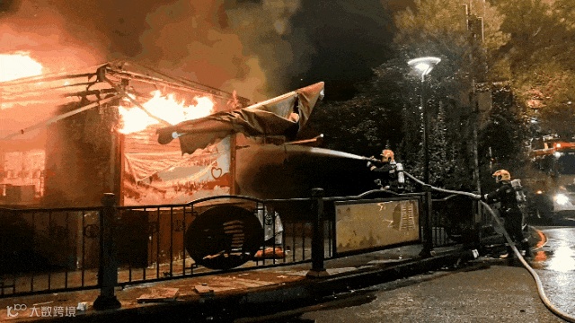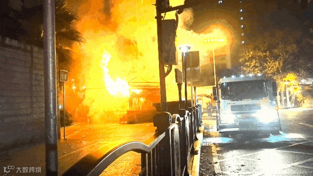 正利用车上的“高炮”瞄准着火店铺喷水灭火