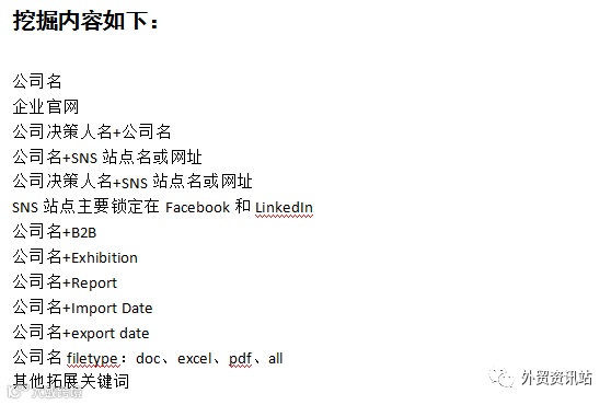 客户背景的调查分析最低成本的一步,就是充分利用谷歌的搜索指令灵活搭配,搜索挖掘客户信息。一定要熟悉谷歌的各类搜索指令,并灵活运用。