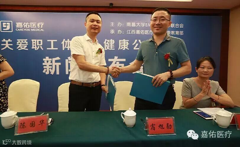 陈国华董事长在讲话中提到,一直以来,嘉佑医疗集团始终致力嘉佑医疗公益品牌内涵建设,至2005年嘉佑医疗集团就以其优质的医疗水平和专业的医疗服务深受广大居民的青睐,在10年的发展历程中,公益体检活动持续开展,2014年为响应市卫生局升级“服务在基层 健康进家门”倡议精神,嘉佑医疗集团组建了健康教育部,将集团所属仁爱、曙光、博大三家医院实施统一管理,扩大了社区公益体检服务项目,去年6月组建至今,已经走过南昌数千个社区乡镇,为5万余人提供免费筛查和健康宣教服务,获得了当地居民和社会的一致好评。南昌大学EMBA企业家联合会企业学员建议企业职工重视亚健康状况,联合嘉佑医疗集团教育部为学员单位职工开展免费义诊,并正式签署战略合作伙伴协议,共同见证“关爱职工体检、健康公益行动”启动仪式。