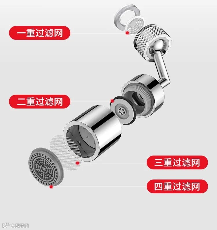 万向水龙头起泡器内部含有四重过滤网,能很好的过滤掉混在水里的泥沙、青苔等粗糙物质,让水流更加柔顺又干净,从源头保障家人的用水安全!