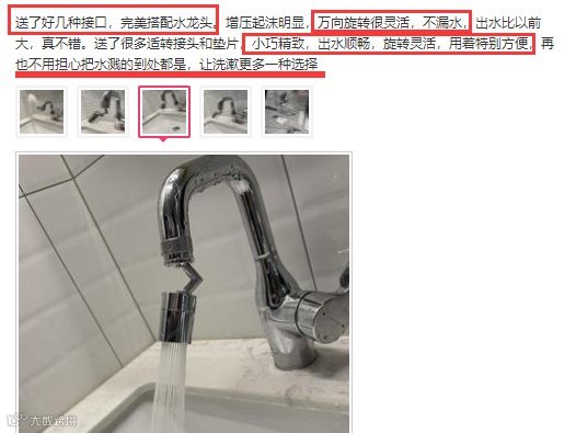 它的安装扣,采用的是滚花轮式的设计,便于安装还不易打滑。先卸下旧的水龙头嘴,然后把万向水龙头起泡器安装上就完成了,很方便。