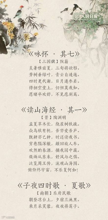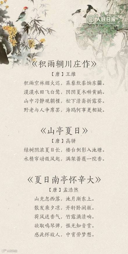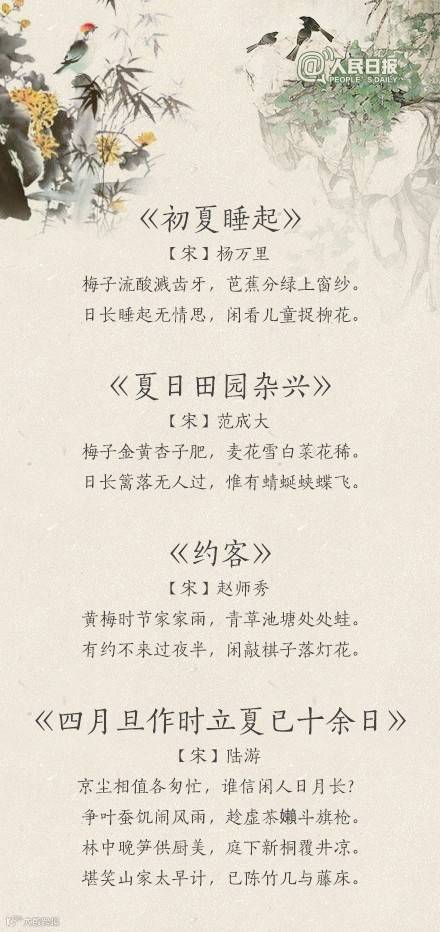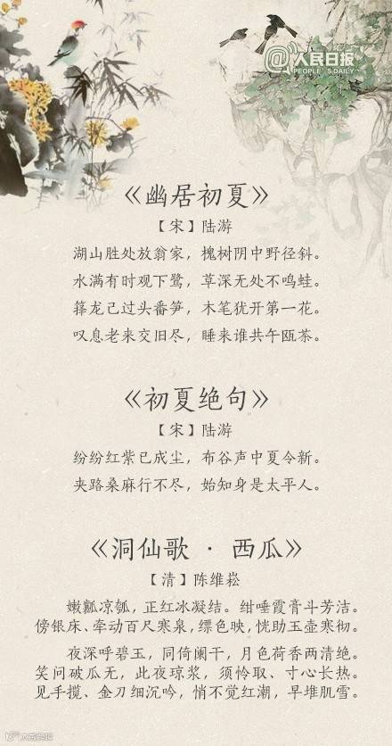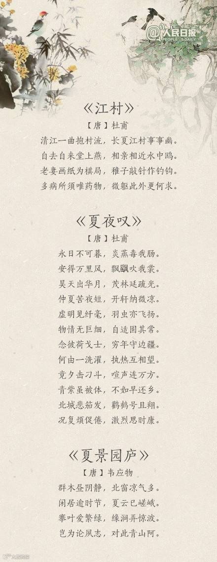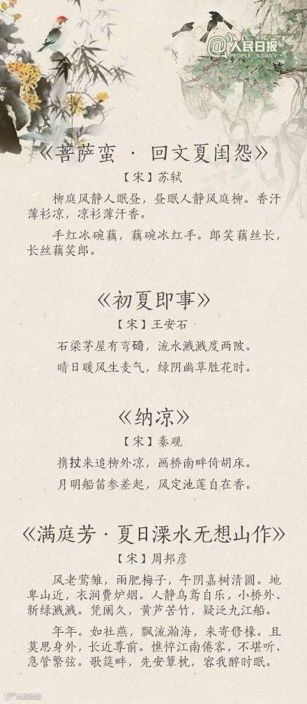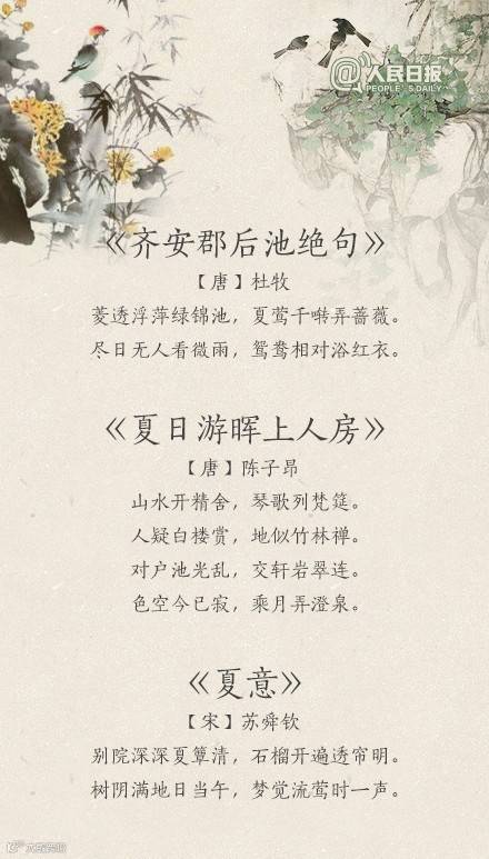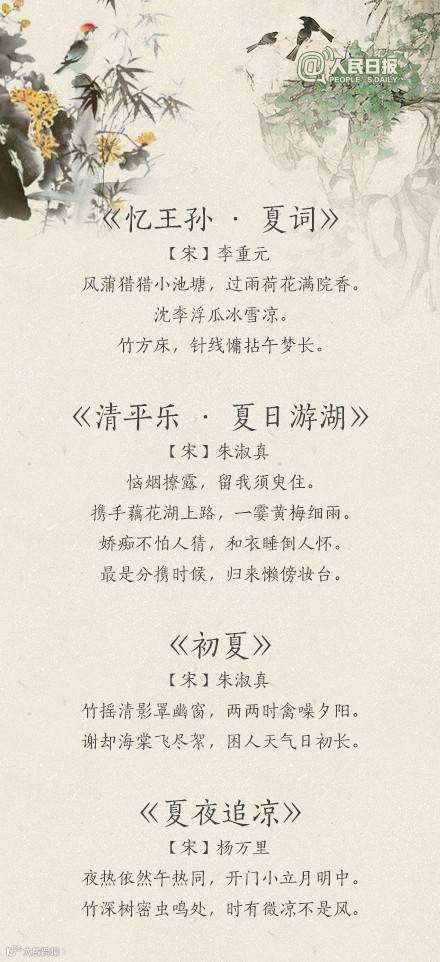 夏天到了,你感受到夏天的气息了吗?“荷风送香气,竹露滴清响”、“风老莺雏,雨肥梅子,午阴嘉树清圆”、“谢却海棠飞尽絮,困人天气日初长”……蔷薇盛开,青梅初熟,恼人的飞絮渐渐消失。古人写炎夏,总是别有清凉情致。看看诗词里的夏天,清心迎夏吧!