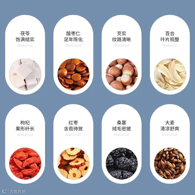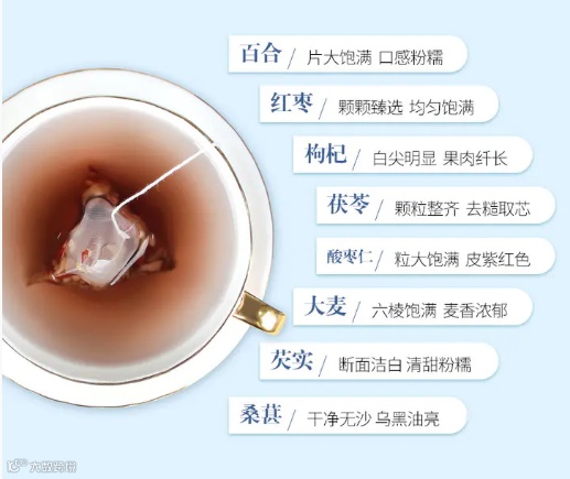 为了将茶作用充分发挥,,有百合、红枣、枸杞、茯苓、酸枣仁、大麦、芡实、桑葚等植物,