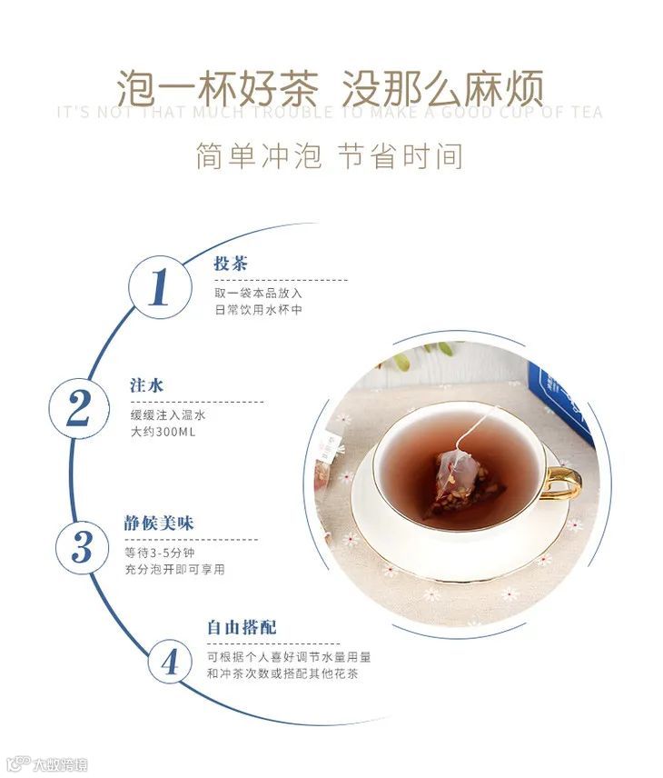 还辅佐了红枣、枸杞、大麦等滋养的天然营养成分,所有成分都是天然甄选,浓缩在这小小的茶包里,