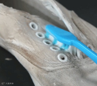 鞋子湿润后把清洁乳倒上去,用刷子来回刷鞋,可以不断补充清洁乳,最后清水漂洗!