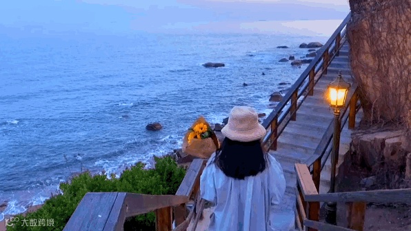 在海景花园大酒店对面沿着木栈道一直走,它就藏在滨海步行道上的山体隧道中。夕阳的余晖透过粉蓝的天空,在海面上波光粼粼,仿佛一不小心走进了油画里,快带着小伙伴一起来看日落,你们也可以成为“画中人”。