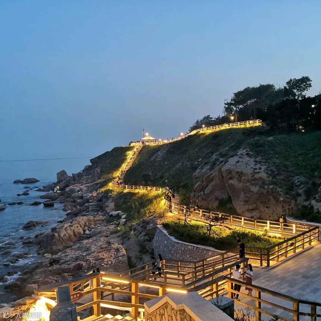 当夜幕降临,燕儿岛山公园更是美成仙境,望向远方,城市的灯火阑珊与大海映衬,黑暗中光亮的木栈道仿佛《龙猫》中的树丛隧道——神秘,不知通向何方。