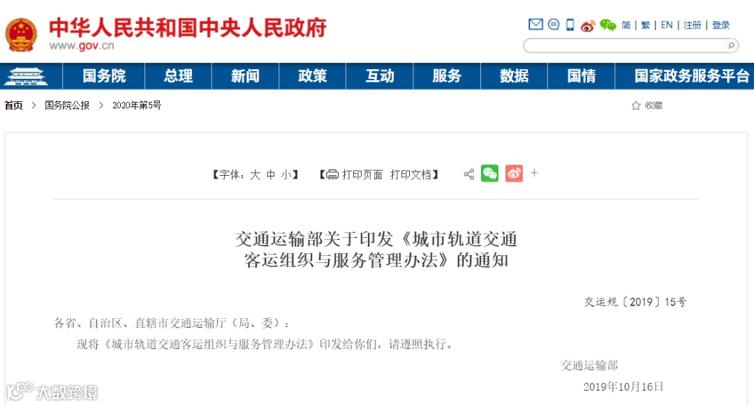 交通运输部印发的《城市轨道交通客运组织与服务管理办法》将于2020年4月1日起施行。