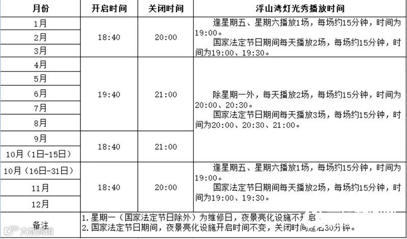 同时,《通知》明确增加浮山湾灯光秀播放场次。淡季为10月16日至次年3月31日,逢星期五、星期六播放1场,开始时间为19:00;国家法定节日期间每天加播1场,开始时间为19:30分。旺季为4月1日至10月15日,除星期一外,每天播放2场,开始时间为20:00、20:30分;国家法定节日期间每天加播1场,开始时间为21:00,每场灯光秀时长约15分钟。