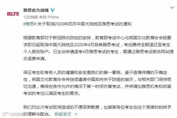 据雅思官方微博通报:根据教育部对于新冠肺炎防控的安排,教育部考试中心与英国文化教育协会按要求即日起取消中国大陆地区2020年4月各类雅思考试,考试费将全额退还至考生个人报名账户。已主动申请退考4月雅思考试的考生,需通过雅思考试报名网站提交退费申请。