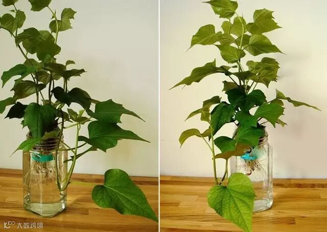 水培后长出红薯叶,可做观赏绿植;可食用,营养价值较高。若种的好,还能长出小地瓜。