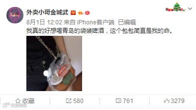 前几天,网友“外卖小哥金城武”在微博晒出了一张照片:“我真的好想喝青岛的袋装啤酒,这个包包简直是我的命。”