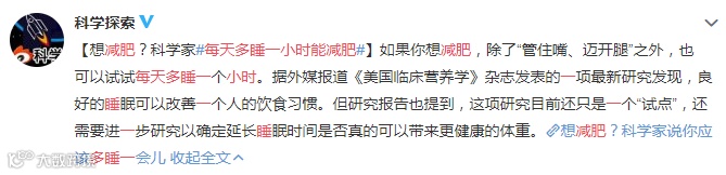 最新研究发现,良好的睡眠可以改善一个人的饮食习惯。延长了睡眠时间可以减少10克糖的摄入量,还有碳水化合物摄入量。也就是说,每天多睡一小时能减肥!!