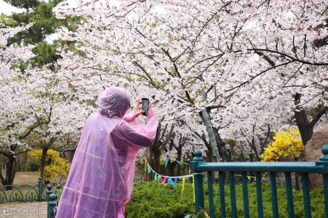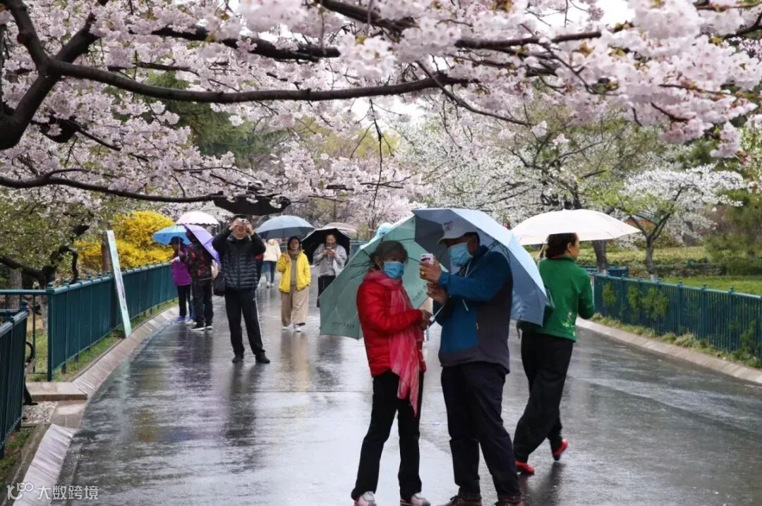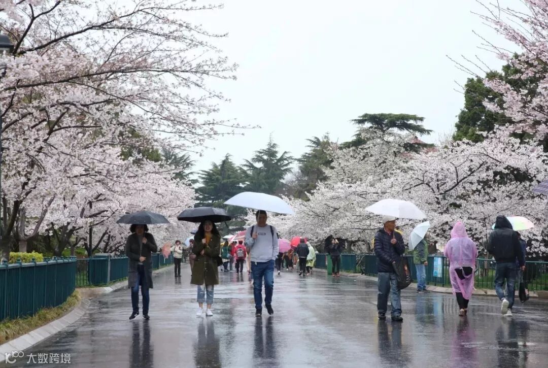 不少人前往观赏雨中的樱花