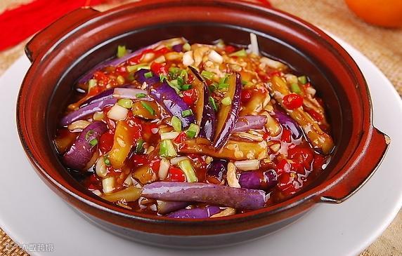 4、依次放入茄子、剁椒、甜面酱、醋、白砂糖和盐,添少许水或鸡汤,加盖焖2分钟