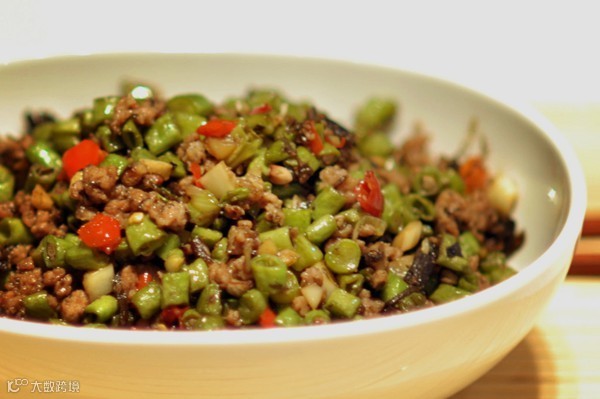 1、肉馅中倒料酒,搅拌备用,四季豆切粒