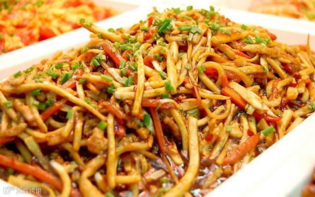 4、倒入笋丝和木耳丝,调好的汁,由下向上翻炒20秒钟,待汤汁略黏稠即可。