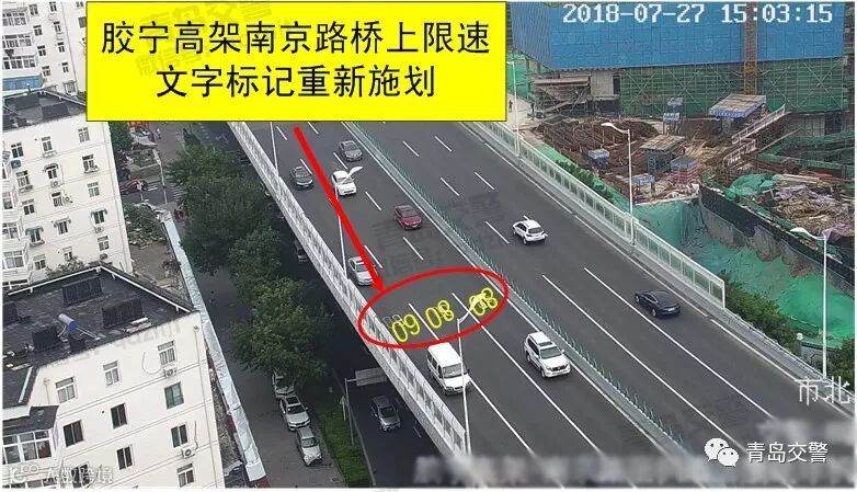 3、取消现有的胶宁高架山东路与福州路路段间其他位置施划的地面限速标记“80 80 60”。这些标记与标志限速值不一致且样式、颜色与国标要求不符。