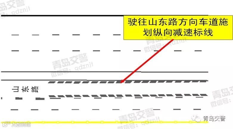 1、设置纵向减速标线。在前往山东路方向车道,自设置限速60标志位置开始向西至分道行驶标志设置位置施划纵向减速标线。