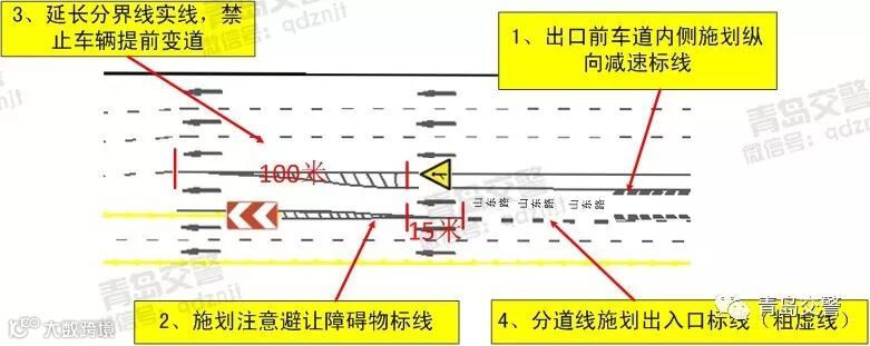 4、在施划“山东路”文字标记的路段距离内施划出入口标线(粗虚线),如图措施4所示。