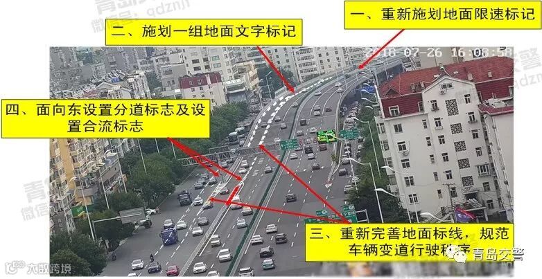 为改善胶宁高架路通行状况,减少交通事故,保证行车安全,青岛交警根据《道路交通标志标线》、《城市道路交通标志标线设置规范》等国家标准,通过实地调研,重点对胶宁高架路东向西方向南京路至山东路路段的交通组织进行优化,具体方案如下: