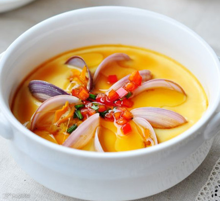 做法:1)准备原料。2)蛤蜊吐净沙子后,烧开水,放入蛤蜊,开口一个捞一个。蛤蜊全部捞出备用。3)鸡蛋充分打散,兑入等量的温开水。加入盐充分搅拌均匀。4)蛤蜊摆在炖盅内,或者碗里。5)滤网过滤蛋液入容器内。包上保鲜膜用牙签戳几个小洞,或者盖上蛋盅盖子。中小火蒸8分钟-10分钟即可。6)红椒,豉油,香油,兑好7)蒸好的蛋羹吃的时候淋上步骤6中的料汁即可。