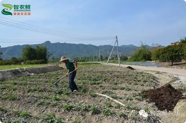 智农夫在为地瓜叶菜锄草施厩肥(厩肥,指家畜粪尿和秸秆、杂草、落叶、泥炭和干土等、饲料残茬混合堆积并经微生物作用而成的肥料。富含有机质和各种营养元素。)