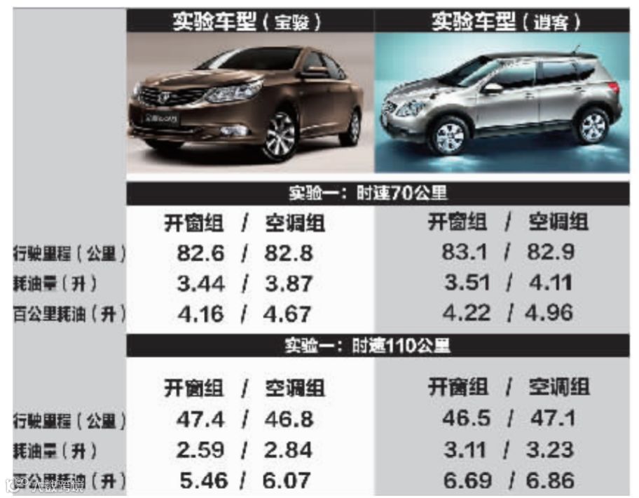 两组车辆(分别为两两相同车型的三厢轿车和SUV),每组中都有一辆选择窗、一辆选择开空调,在70公里时速和100公里时速的情况下尽量匀速行驶近百公里。