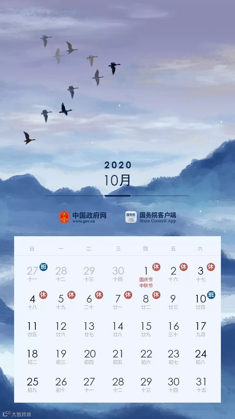 国庆节、中秋节:10月1日至8日放假调休,共8天。9月27日(星期日)、10月10日(星期六)上班。