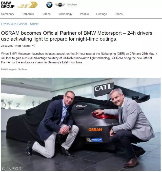 今年五月,欧司朗正式成为宝马赛车运动官方合作伙伴,与宝马共同出征2017纽博格林24小时耐力赛!在本次赛事中,欧司朗通过专业照明解决方案,用灯光科技助力宝马在本届耐力赛中获得近年来最好成绩。